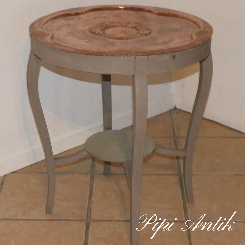 02 Kakifarve messing rundt bord patina look Ø58,5×65 cm i højden Malet med Annie Sloan Chalk Paint French Grey og Paris Grey og lakeret topplade.