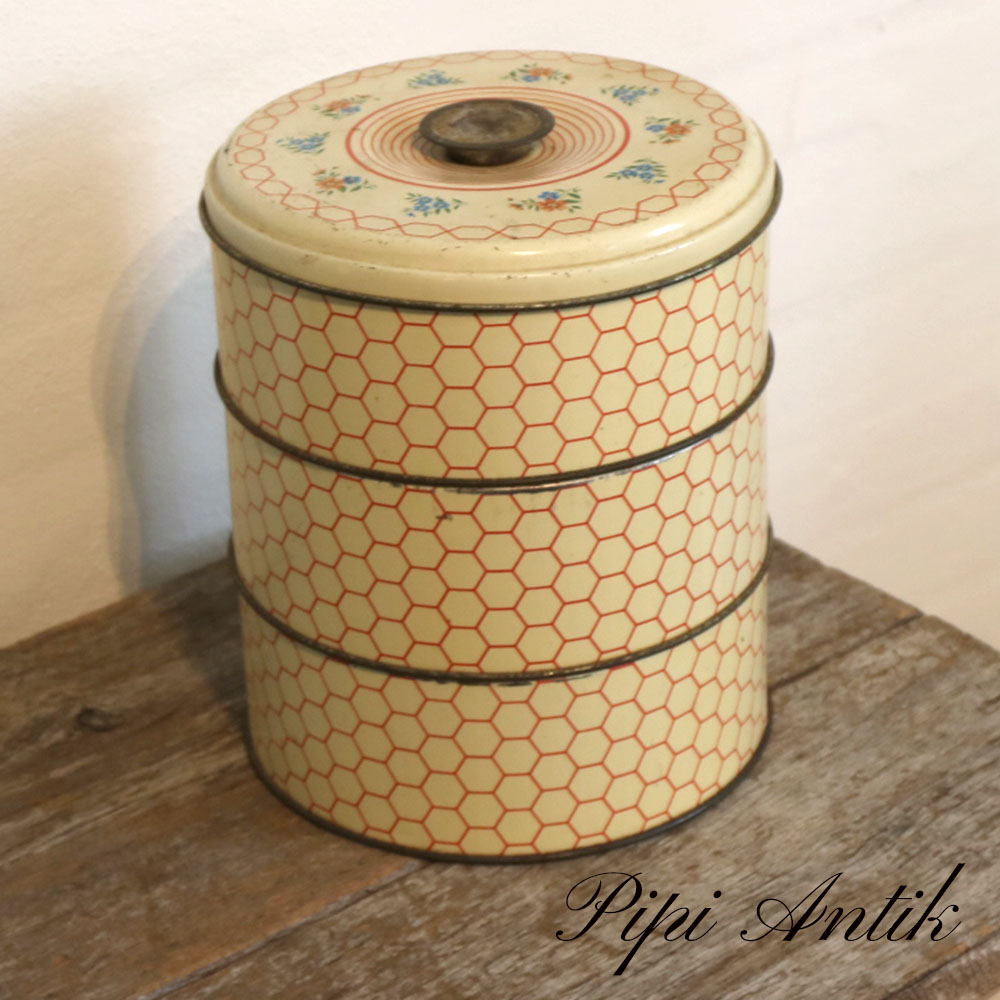 34. Retro kagedåse 3 etager cremefarvet mønstret patineret Ø20xH23cm