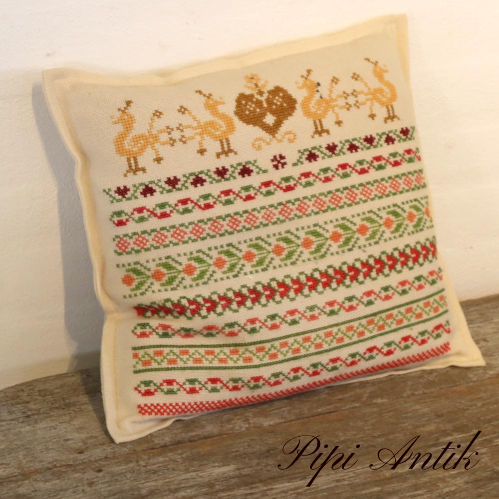 Broderet pude pastelfarver grøn rødlige creme L37xH35cm