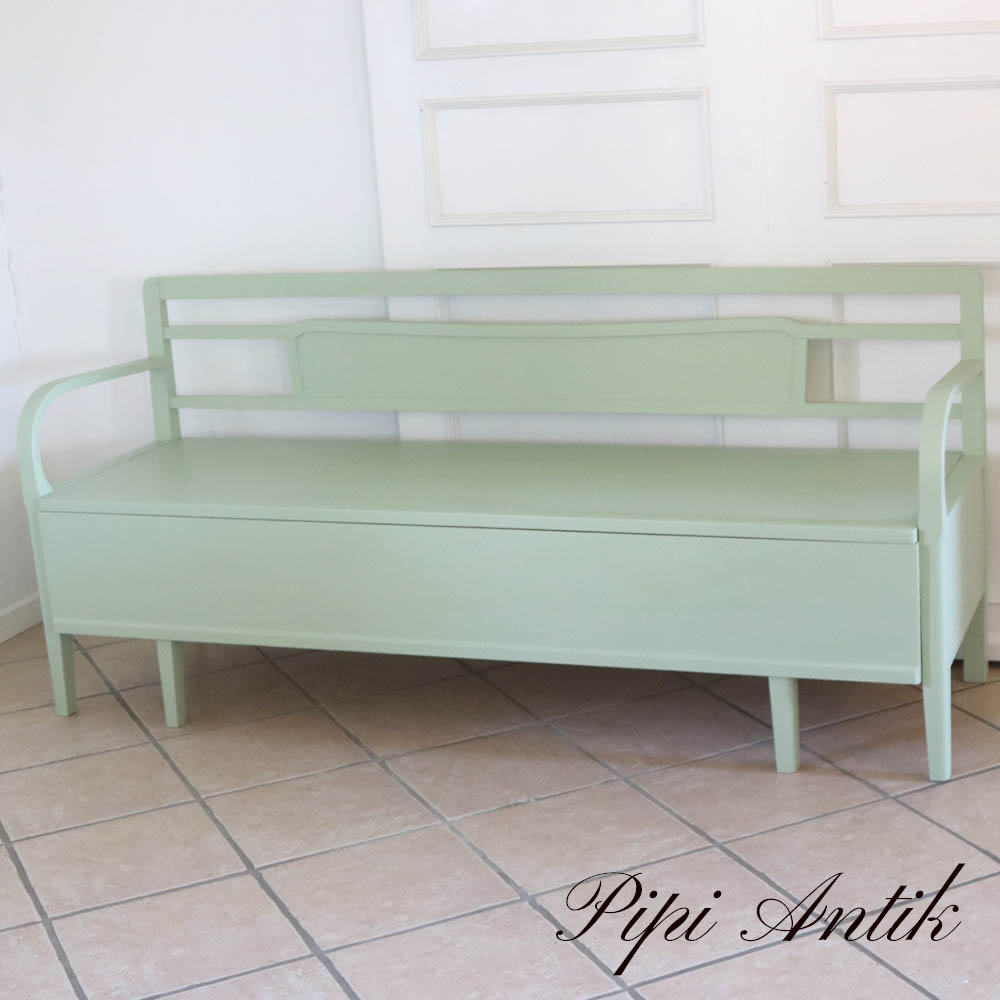 Pastelgrøn slagbænk L179xD54,5xH80,5 sædethøjde 45,5cm m opbevaring.