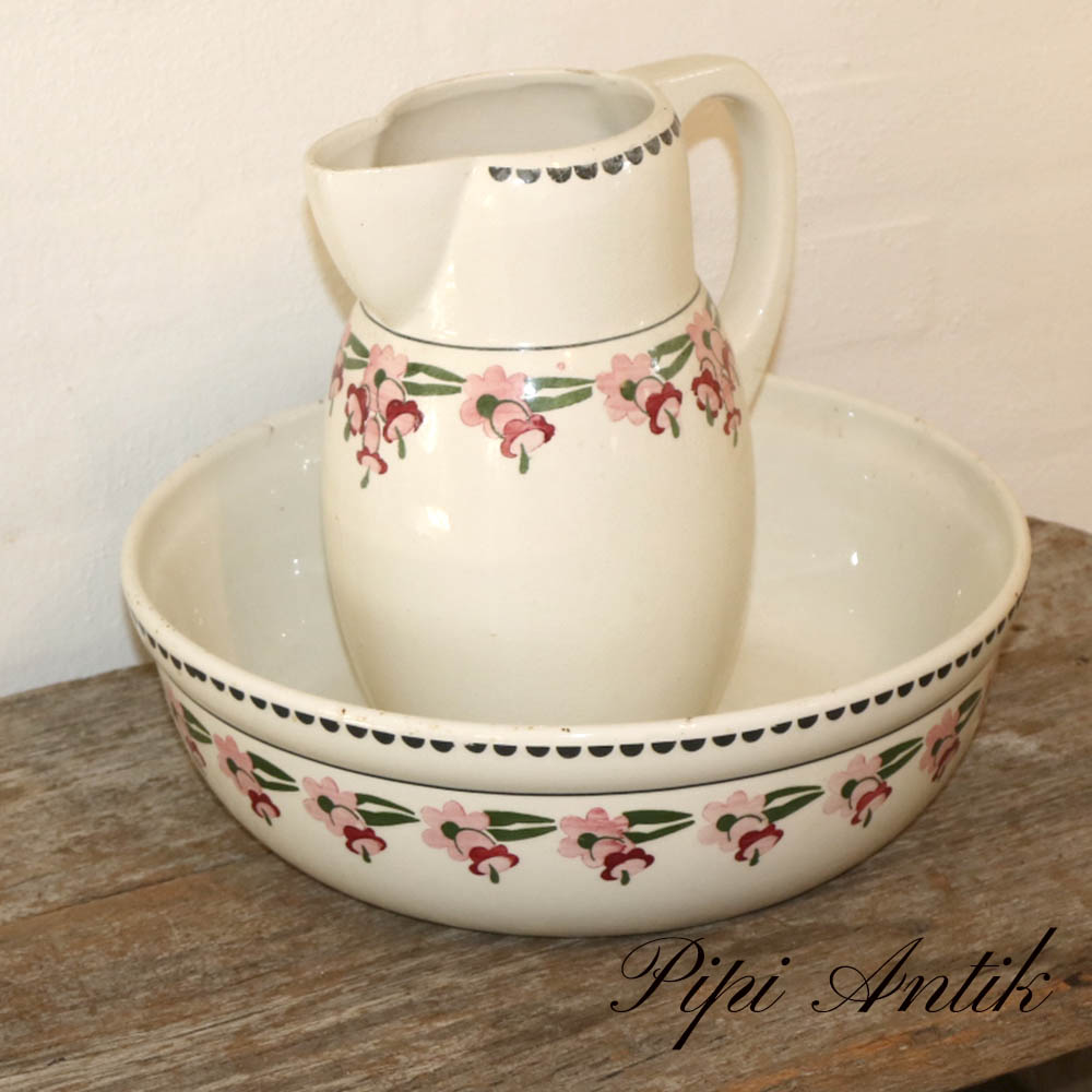 Servantesæt med vask og kande i råhvid og rosafarvet blomster Ø33xH26cm