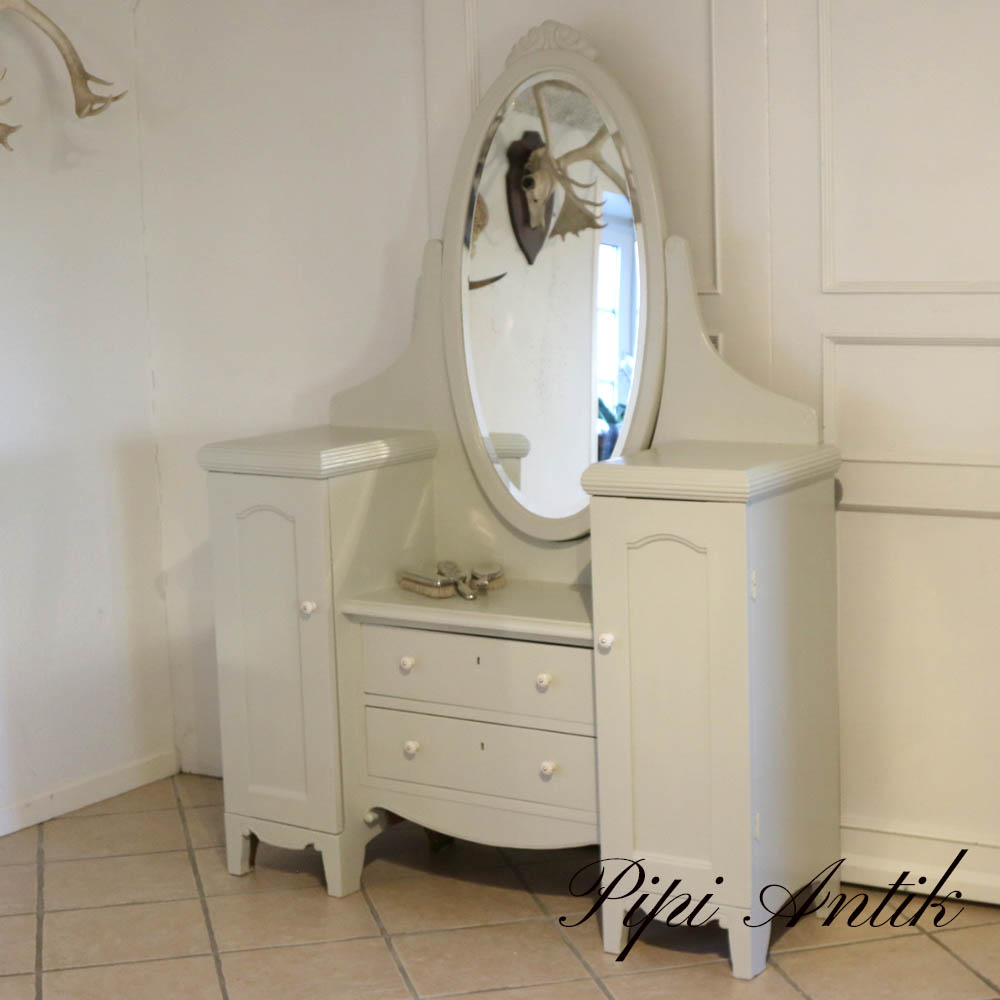 Sminkebord i beige sandfarvet B129xD42xH180cm bordH 95 og 64cm. MALEPRO. Maling krakkeleret i kulden! Sat ned pga. maling afskalling samt patina fra vinterens kulde på spejlet.